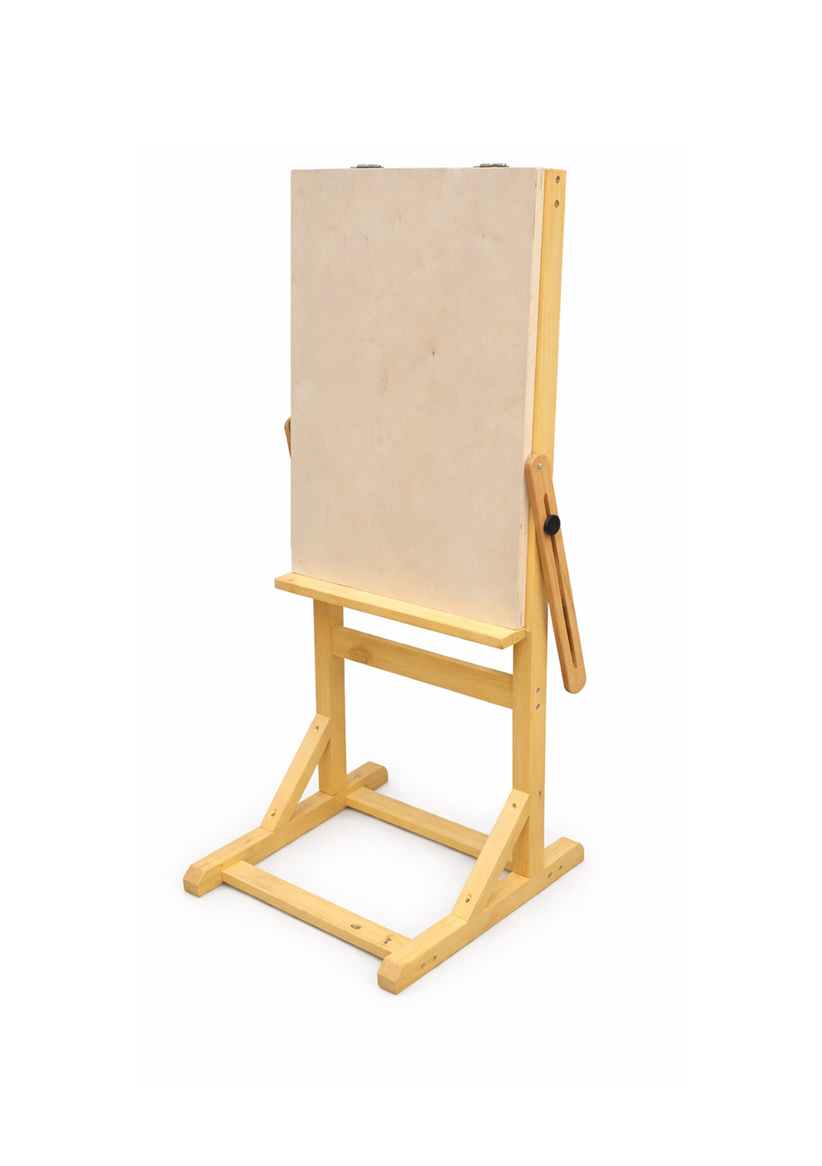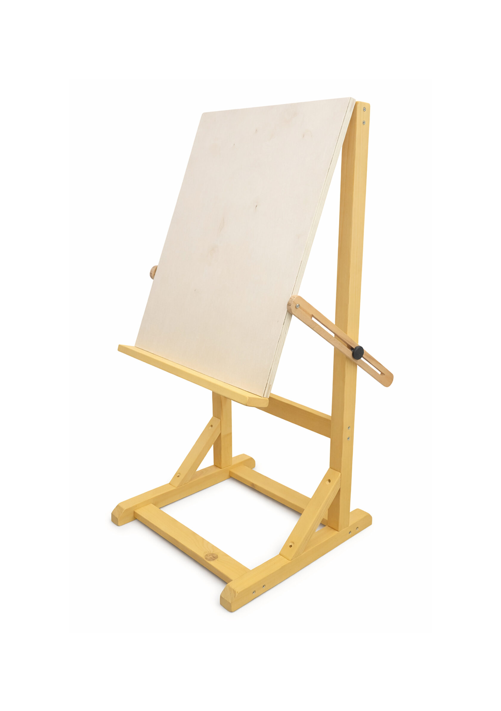 Студийный мольберт для больших форматов. Очень прочный и долговечный. Узел наклона позволяющий изменять угол планшета от 90 до 35 градусов. В нижней части планшета есть полка для кистей и красок. Подходит для всех видов живописи и рисунка на бумажных или картонных носителях.