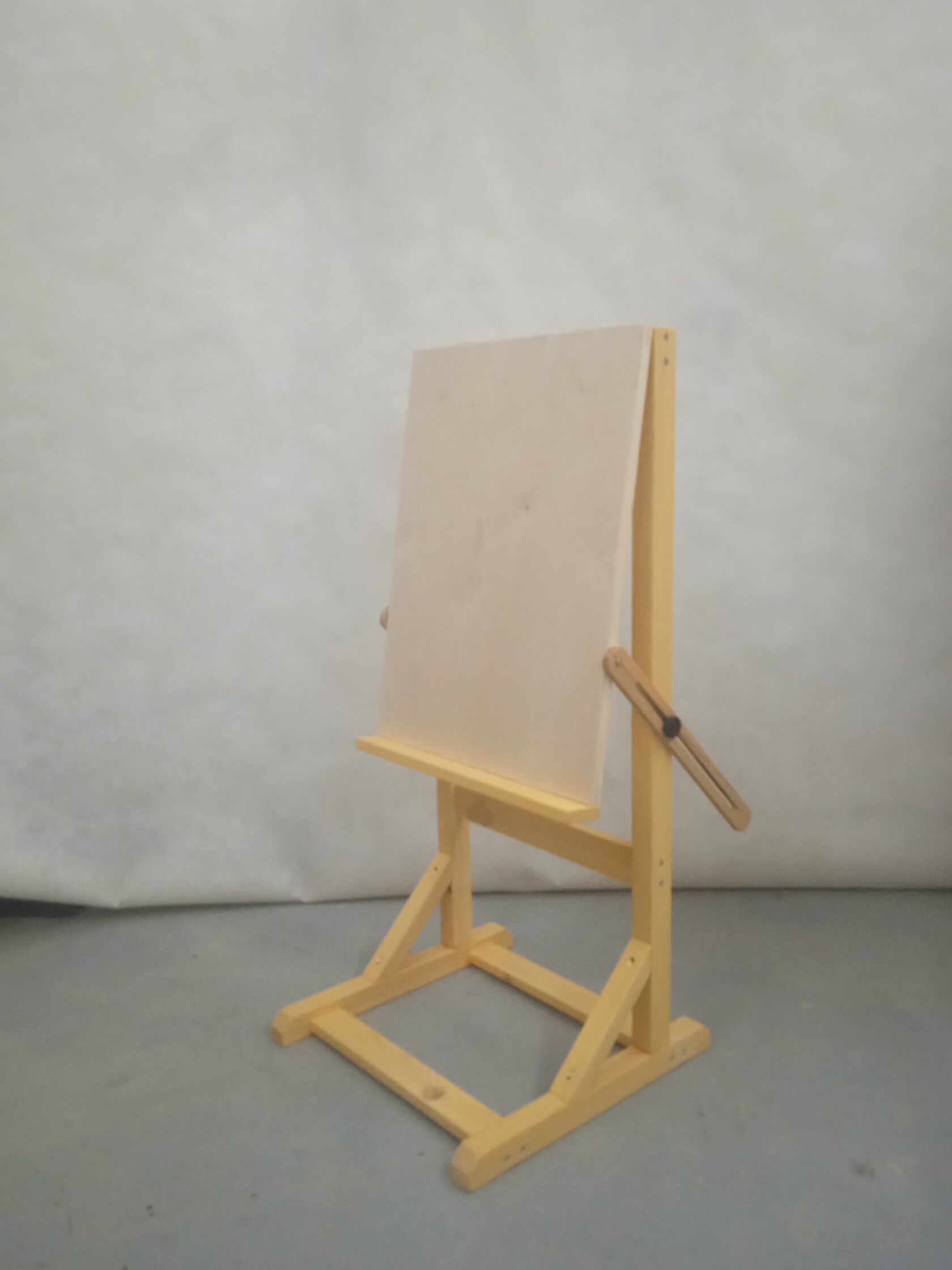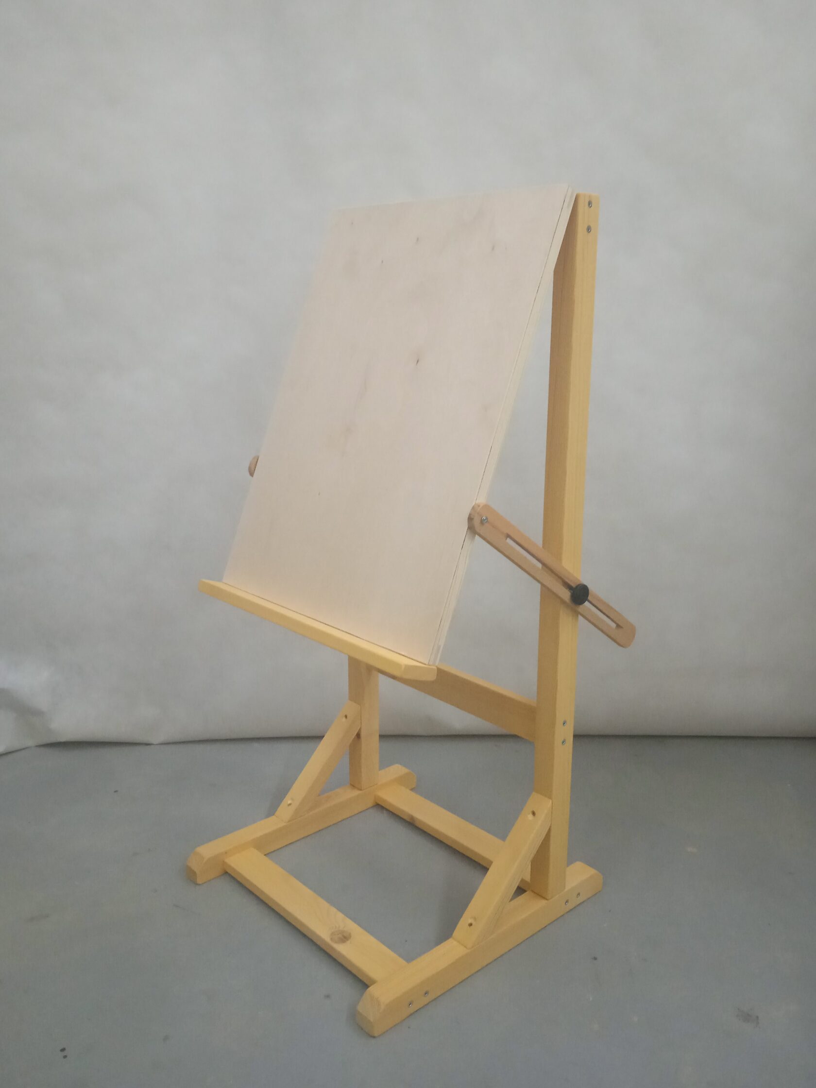 Небольшой мольберт с постоянным наклоном верхней рамы и подвижным бегунком. Подходит для миниатюр и экспозиции. Может служить для выставки декоративных тарелок с небольшими дополнениями конструкции. Изготовлен из массива бука высшего сорта.