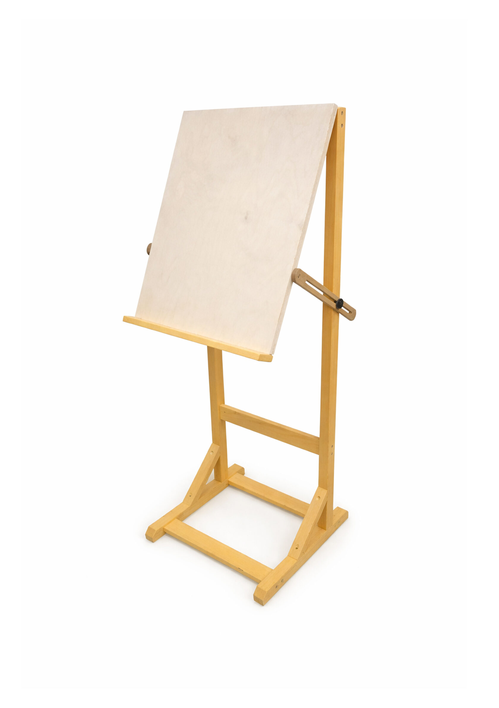 Студийный мольберт для средних и небольших форматов. Очень прочный и долговечный. Узел наклона позволяющий изменять угол планшета от 90 до 35 градусов. В нижней части планшета есть полка для кистей и красок. Подходит для всех видов живописи и рисунка на бумажных или картонных носителях.