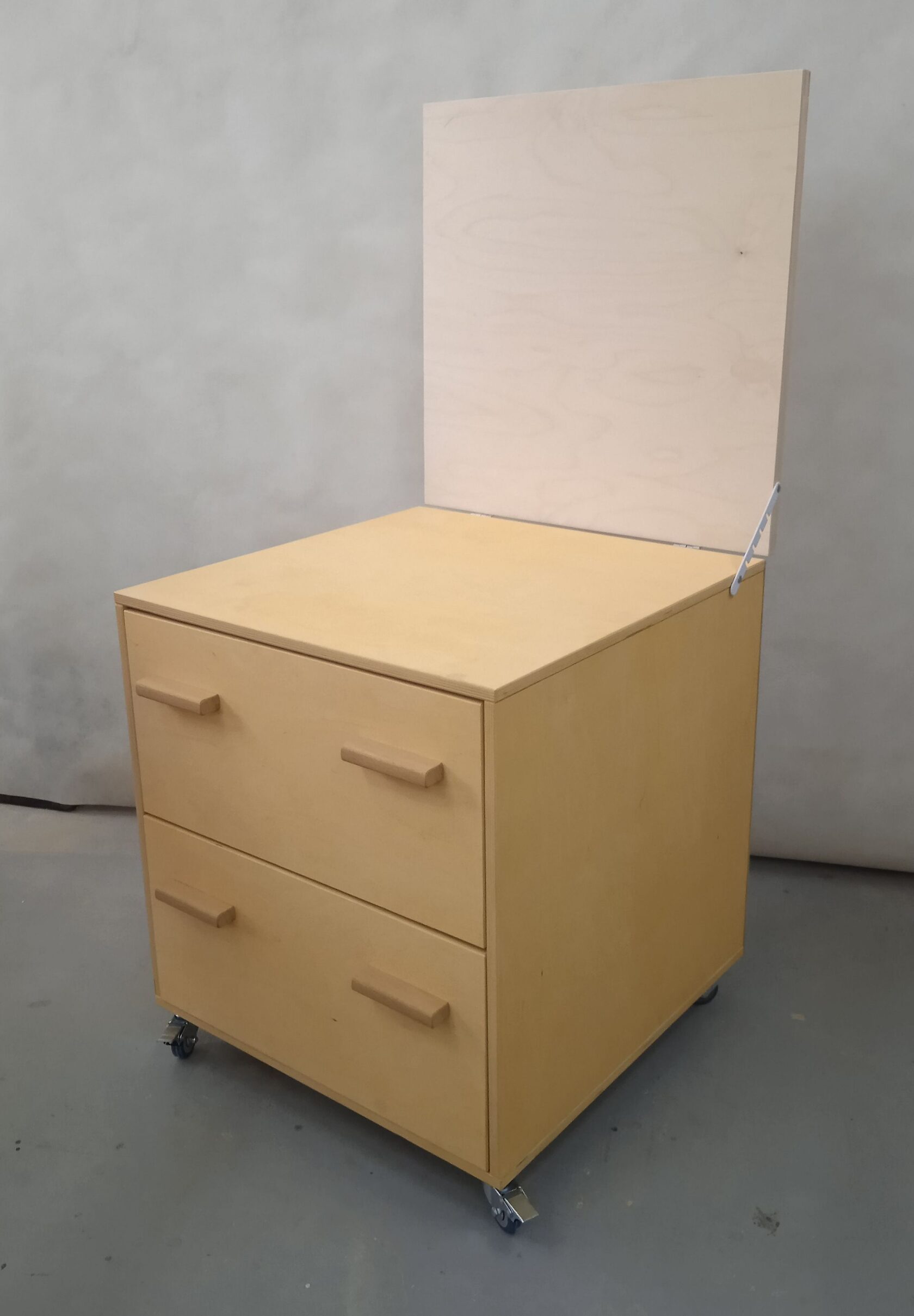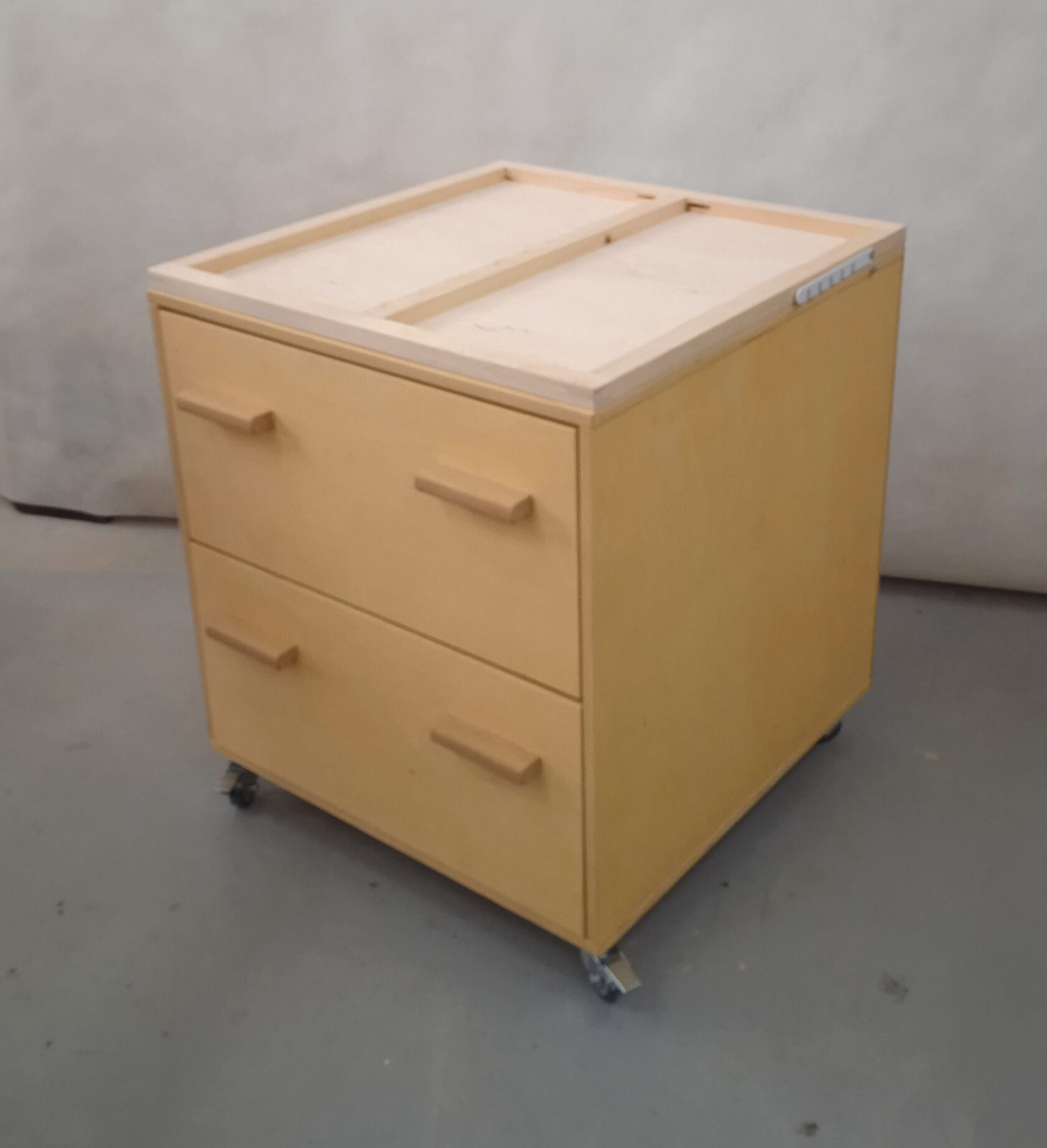 Тумба для постановки натюрмортов со складной задней стенкой для драпировки. Тумба с двумя ящиками для хранения драпировок и элементов натюрмортов. Рабочая поверхность 700х500 или 600х600 мм. Колесные опоры с о стопором позволяют легко перемещать тумбу в классе. Изготовлена из высококачественной водостойкой шлифованной фанеры с акриловым экологически чистым покрытием. Очень прочная конструкция, оптимальное решение для любых художественных классов.